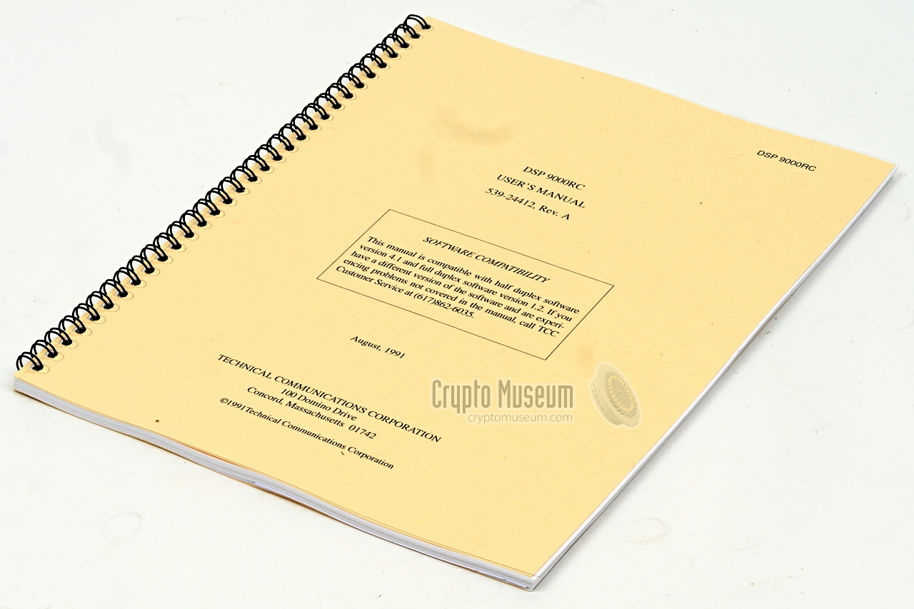 Device Voice scrambler Purpose Voice privacy for two-way radio Principle Enhanced Domain Transform (EDT) Model DSP-9000 Manufacturer TCC Country USA Years 1991 - 2024+ Users Argentina, Austria, Afganistan Response 200 - 2800 Hz (400 to 2500 Hz minimum) Key types Local key, Network key, System key, Initialization Vector (IV) Key space 1.54 1099 (~ 329 bits) Including IV 1.01 10104 (~ 346 bits) Key storage Two EEPROM banks of 400 keys each FILL Smart Module 2K-W Reference TCXO crystal oscillator Data 1200 baud Sync In-band frequency shift keying (FSK) 74-bit sync burst Power 9 to 32V DC Consumption 1W (half-duplex), 2W (full-duplex) Temperature -20°C to +60°C Storage -40°C to +85°C Dimensions ? Weight ?