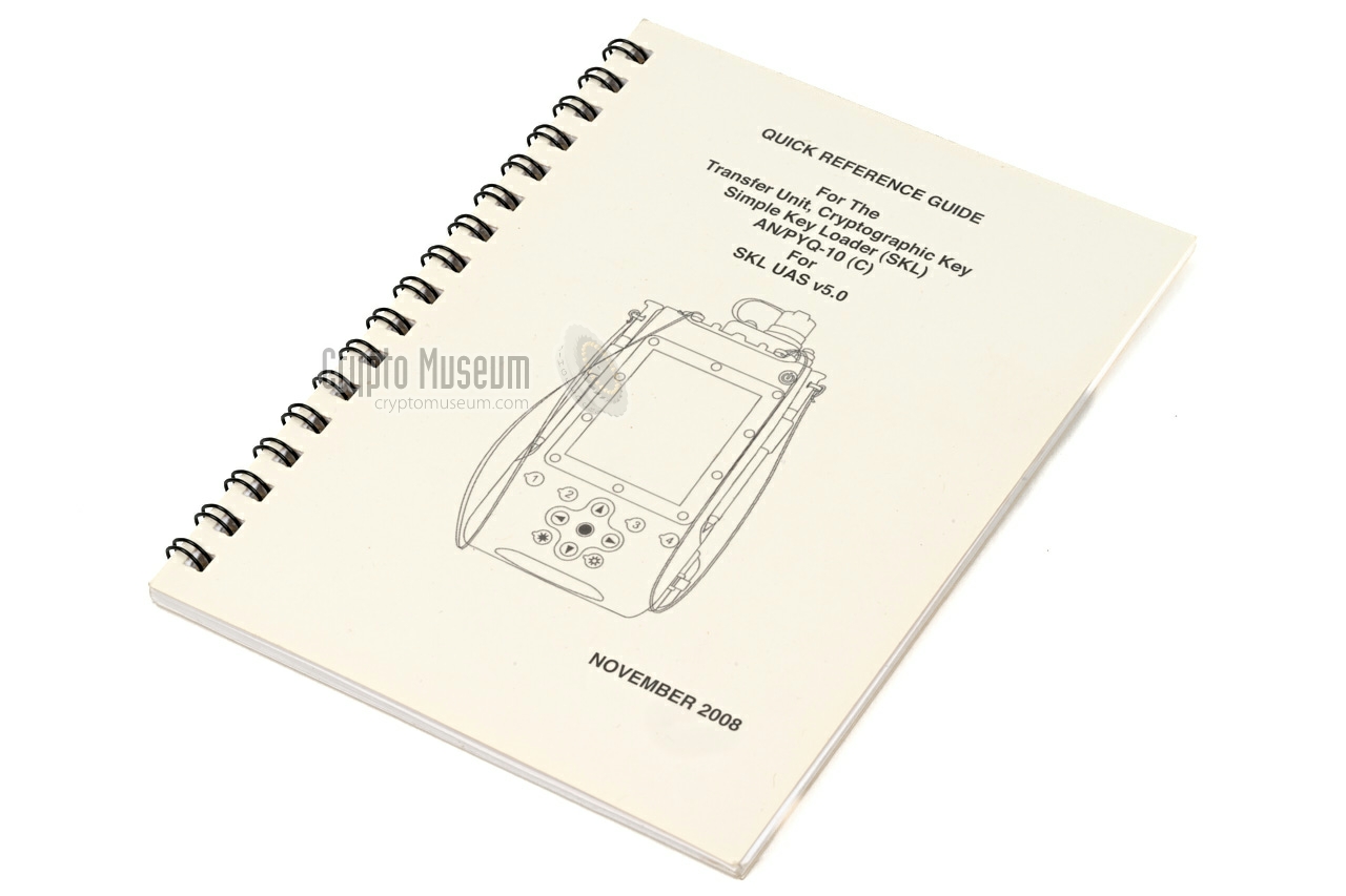 Device Fill device Purpose Transferring keys and other data between cryptographic devices Model AN/PYQ-10A Version 3.2 Name Simple Key Loader (SKL) Manufacturer Sierra Nevada Corporation Year ? Country USA NSN 5810-01-644-4375 LIN C05002 Predecessor AN/CYZ-10, PYQ-10 Successor Secure DTD-2000 System (SDS), KIK-20 Users US Army, NATO Encryption KOV-21 CIK Datakey SlimLine memory token, ON686180-1 Processor Digital Media Processor (800 MHz) OS Windows CE 6.0 ROM 32 GB Flash RAM 256 MB SDRAM 64 MB Display 3.5" Transflective TFT LCD, 800:1, 85° viewing angle, touch, stylus Interfaces USB mini-A, USB mini-B, U-229 (DS-101, DS-102, RS232), CIK Power Battery pack 27Wh or 49Wh Li-Ion (optional mains adapter) EMI/EMC MIL-STD-461E Temperature -30°C to 60°C Storage -30°C to 71°C Humidity 95% ±5%, MIL-STD-810G Dimensions 189 × 108 × 57 mm Weight 641 g Price USD 1695 (May 2005), USD 1708 (FY07) Quantity 380,000 + (2024)