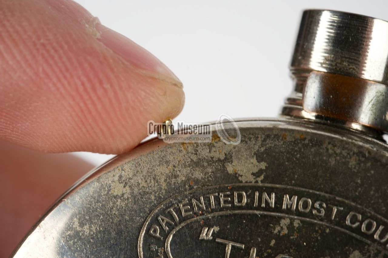 is disguised as the wind-up knob of a watch. It has a metal ring for