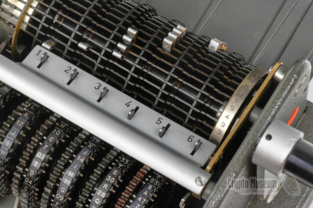 Setting the cryptographic KEY, involves setting of the pins on each of the pin-wheels, installing the wheels in a given order and setting the