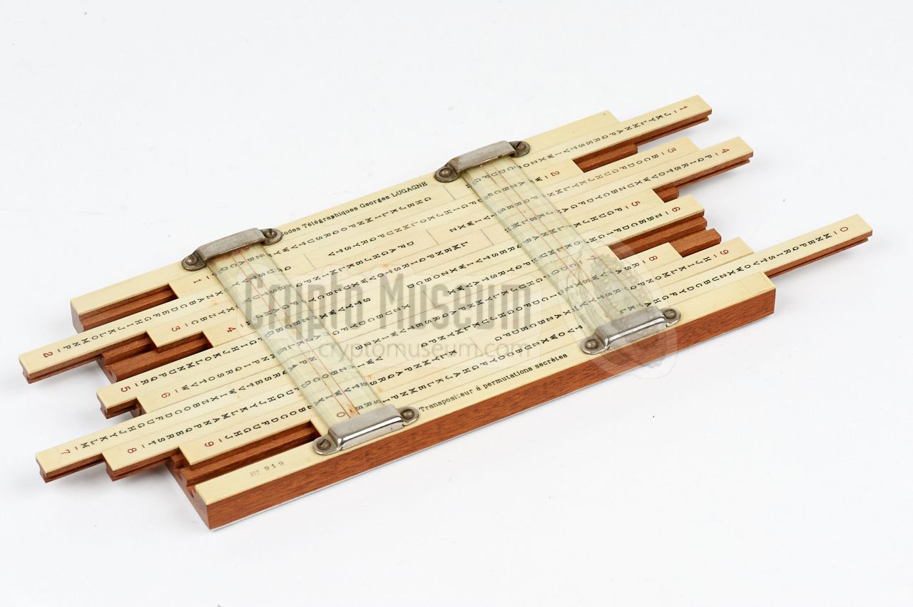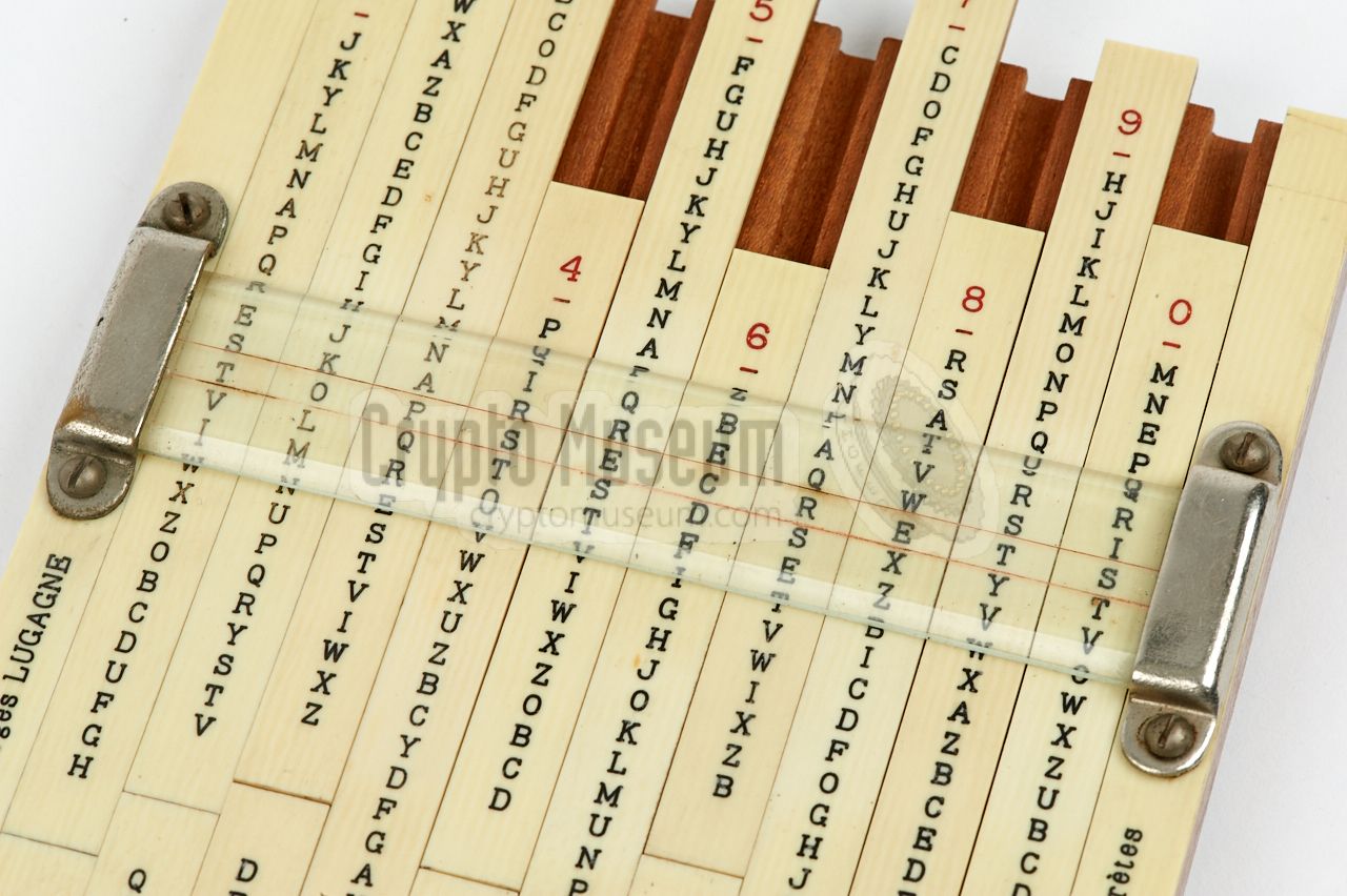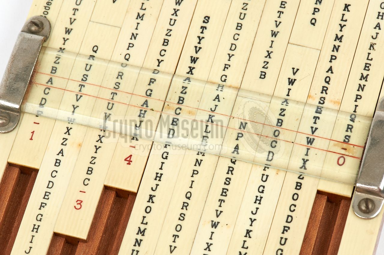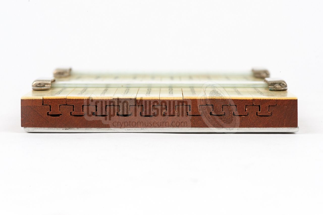 The device has 20 sliding alphabet rulers, 10 of which can be identified as the