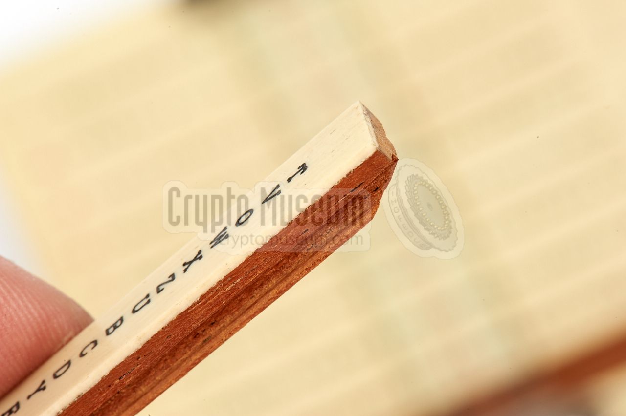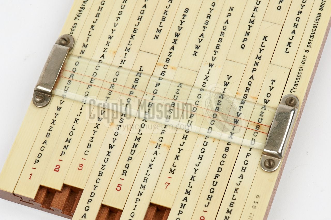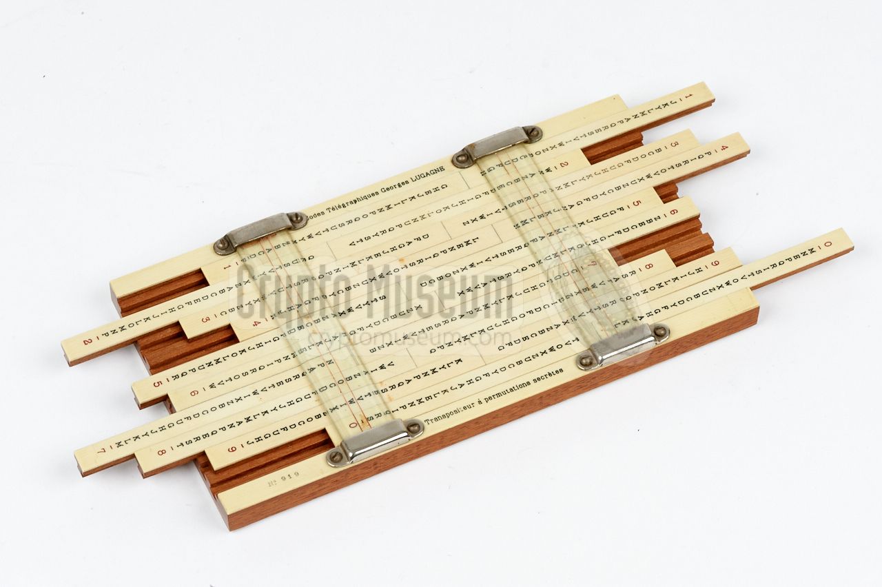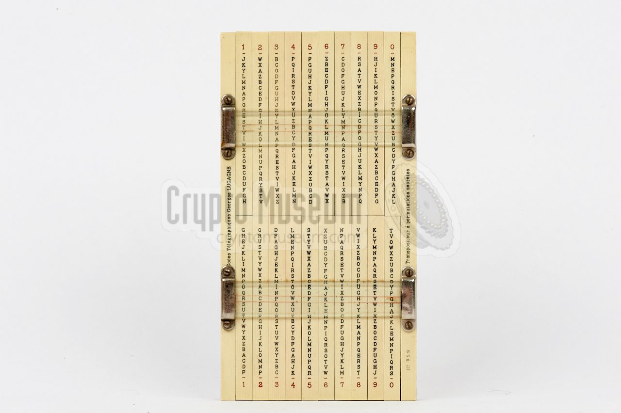 The device has 20 sliding alphabet rulers, 10 of which can be identified as the