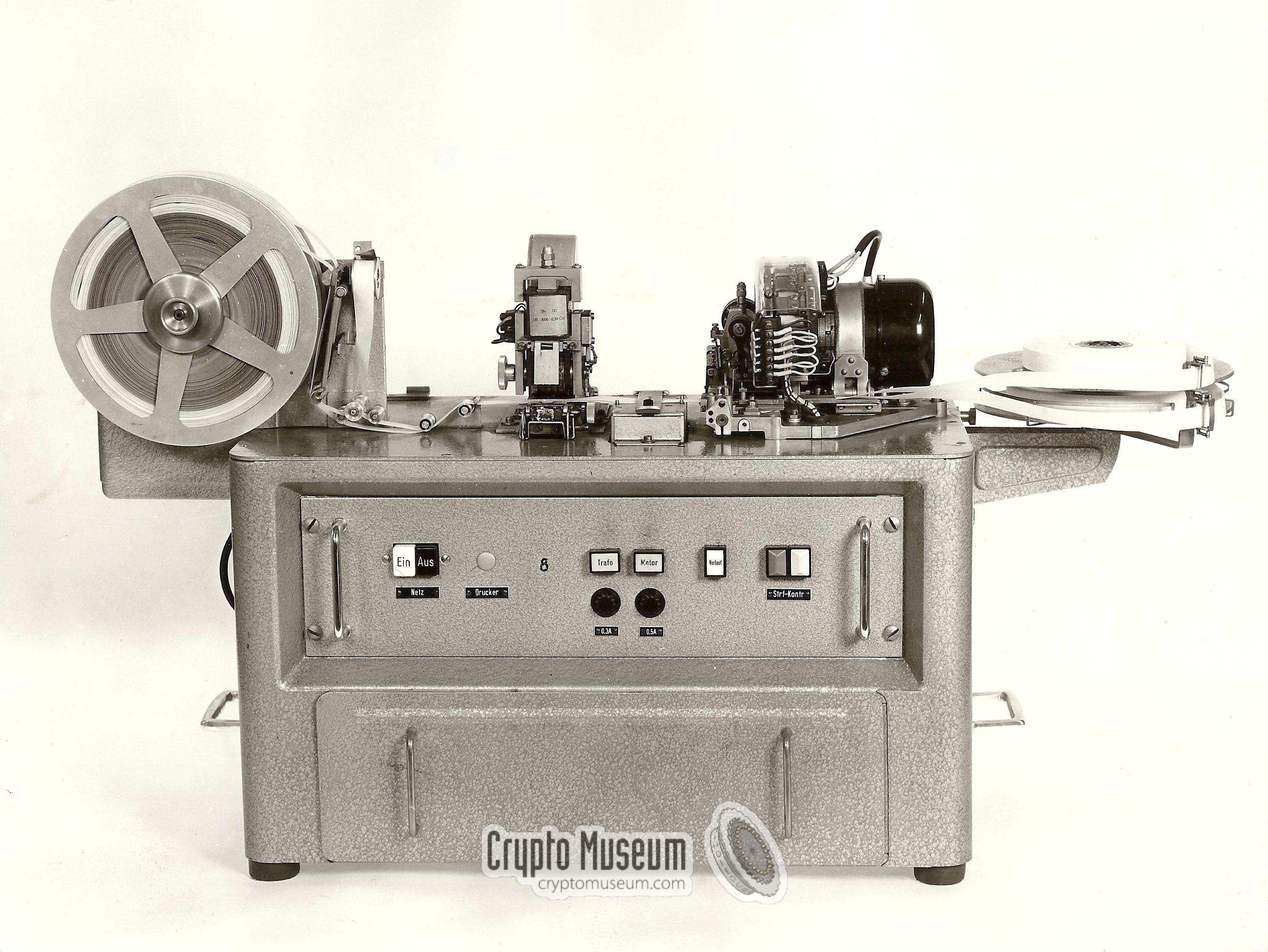 Blank tapes are entered into the puncher at the right, where the two