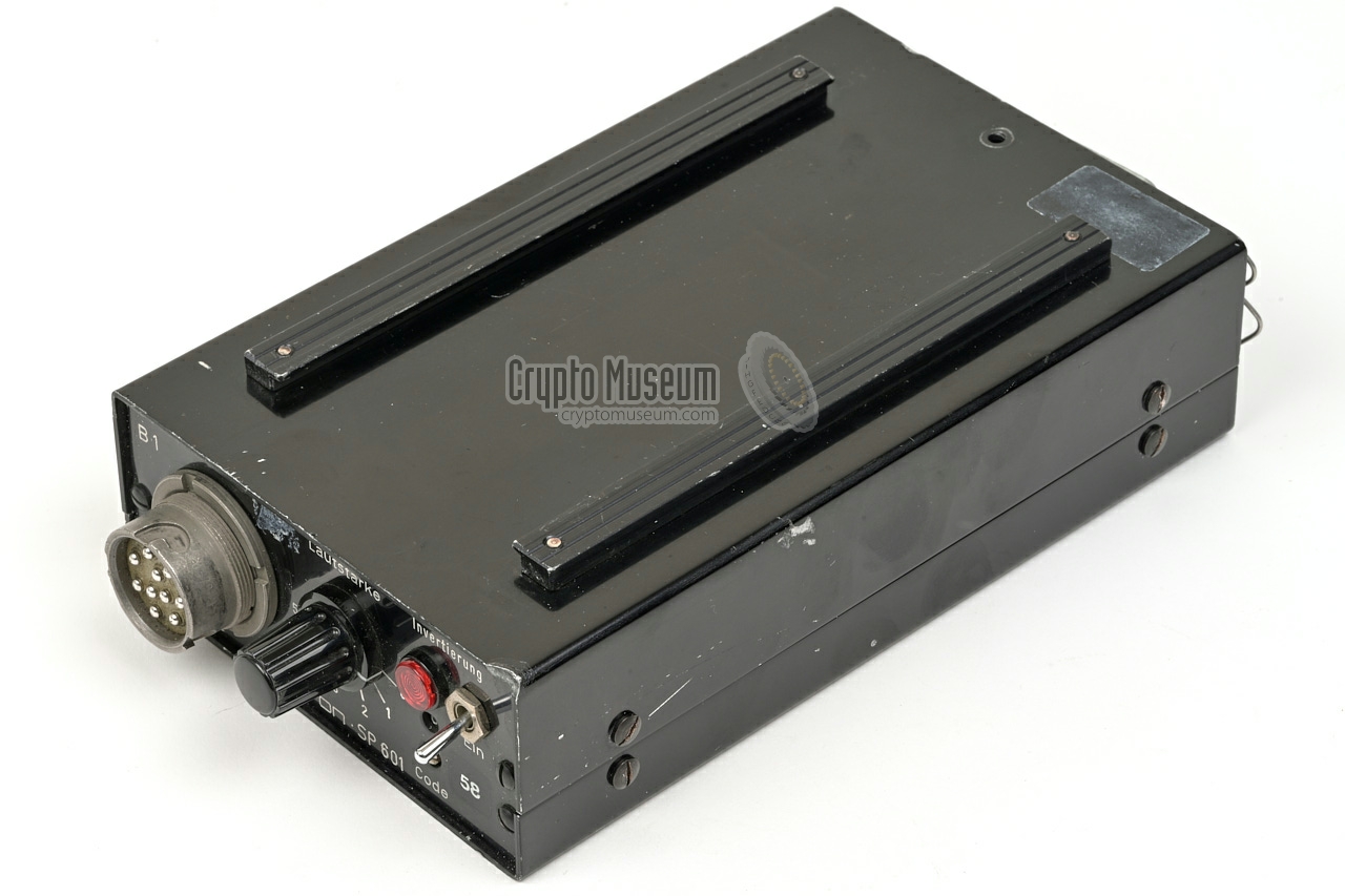 SP-601 was a frequency domain voice scrambler, introduced in 1972 by Teltron in München (Ger­many). It was intended for use by law enforcement agencies, in particular the police, and could be used with existing analogue VHF/UHF 2-way radios. Its operation is based on single-frequency inversion of the audio spectrum, with six user-selectable scrambling codes (1-6).