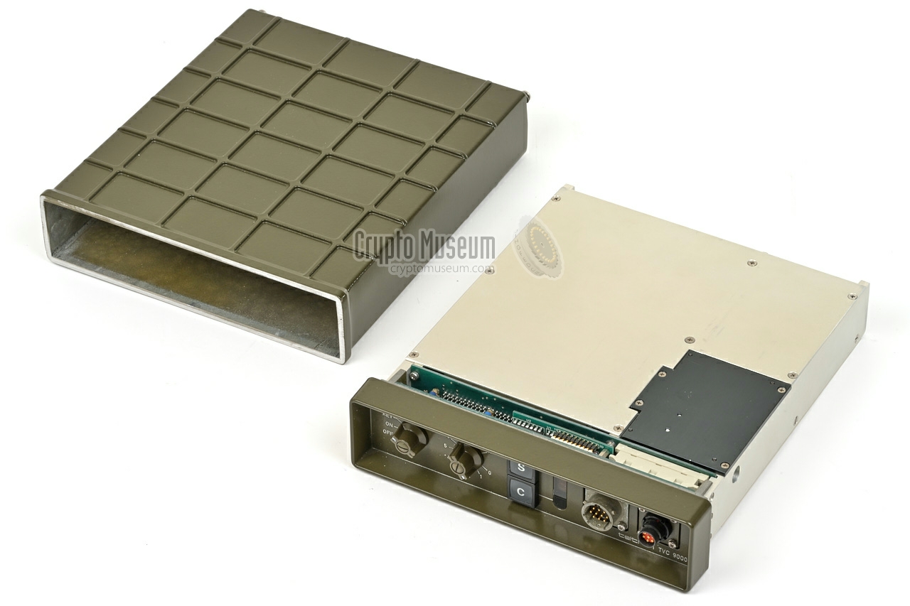 Device Frequency and time domain voice scrambler 1 Purpose Secure mobile cellular conversions on analogue network Model TVC-9000 Manufacturer Teltron Year 1984 Country Germany Principle 8 fragment time / 16 fragement frequency division Algorithm Proprietary non-linear Period 500,000 hrs Keys see below Waveform Delta modulation (CVSD) 64 kbps Delay 1 s (in secure mode) Processor Z80 ROM 8KB RAM 2KB Power 11-15V DC (24V optional) Current 300 mA Temperature -10°C to +60°C Storage -20°C to +80°C Humidity ≤ 95% Dimensions 51 × 213 × 252 mm (HWD) Weight 2351 g