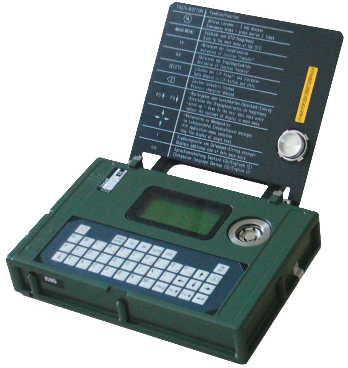 a keyboard with 43 keys. It can handle variable length black and red keys, that are protected by means of a Crypto Ignition Key (CIK).
