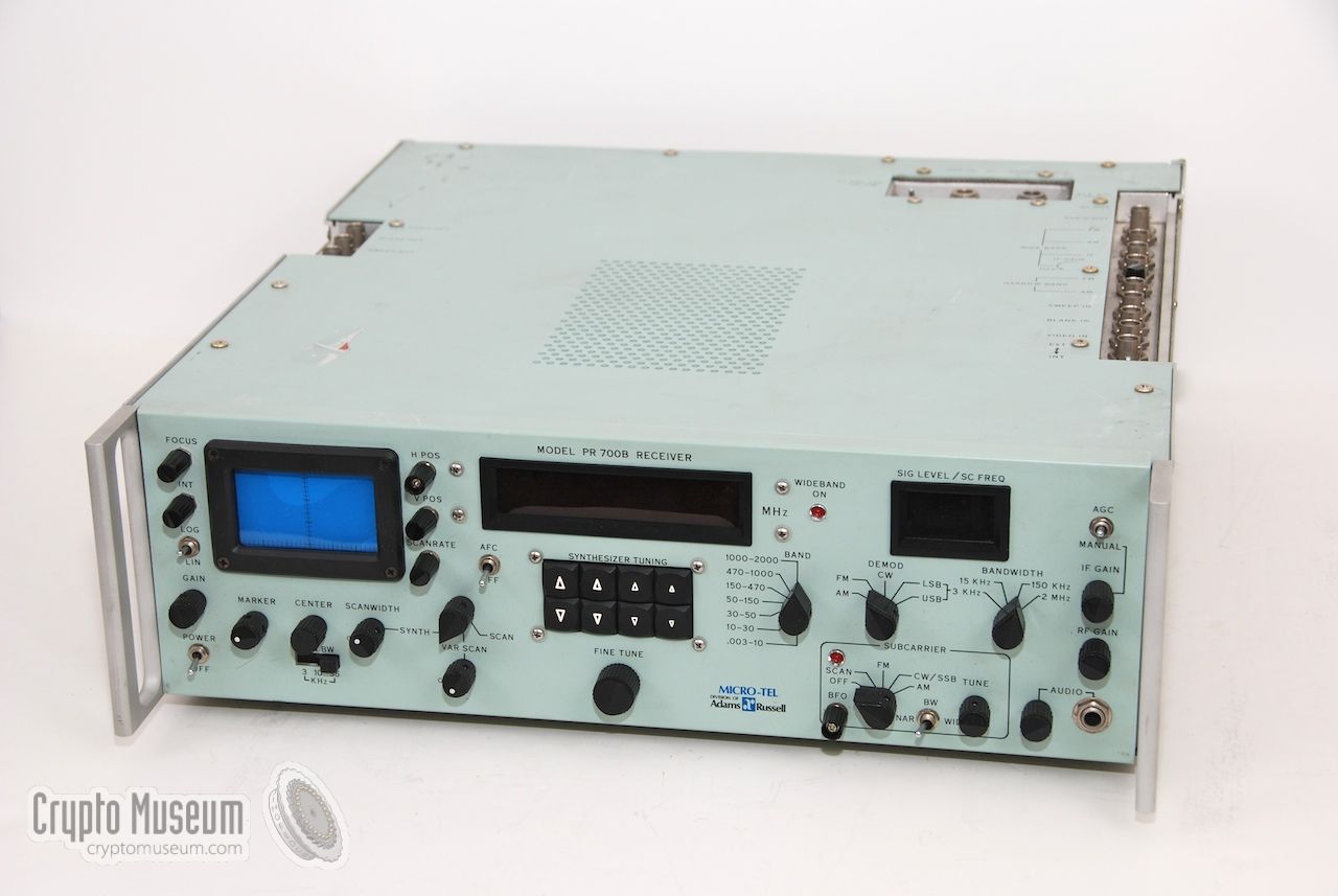 Device Surveillance receiver Purpose Surveillance, monitoring Model PR-700 Manufacturer Micro-Tel Country USA Year 1978 (est.) Frequency 3 kHz - 2 GHz Resolution 10 Hz, 100 Hz Bandwidth 3 kHz, 15 kHz, 150 kHz, 2 MHz, 20 MHz Subcarrier 0 kHz to 200 kHz