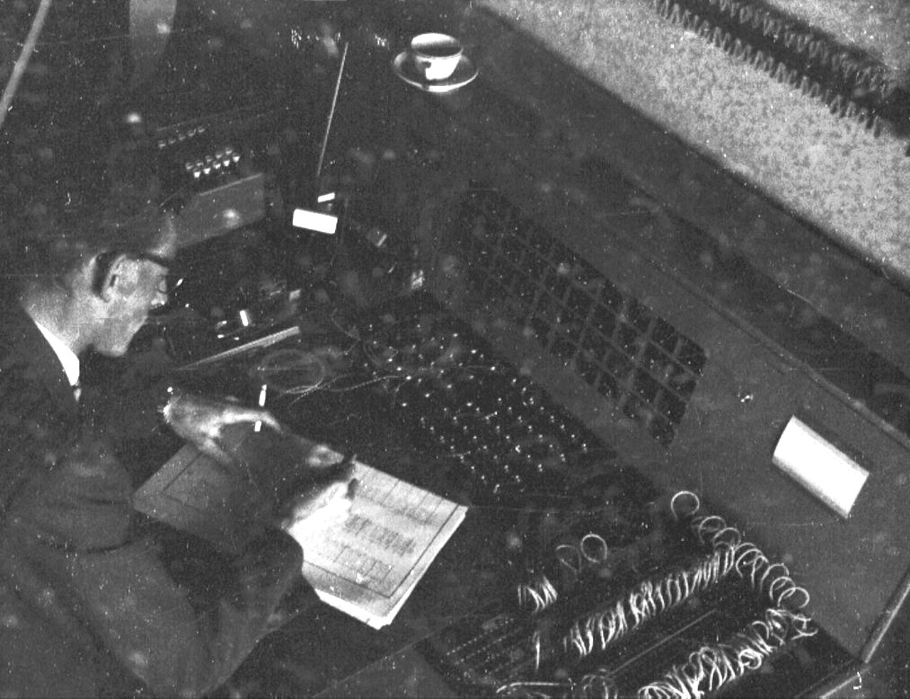 and a large patch panel at the right. In front of the operator is a circuit