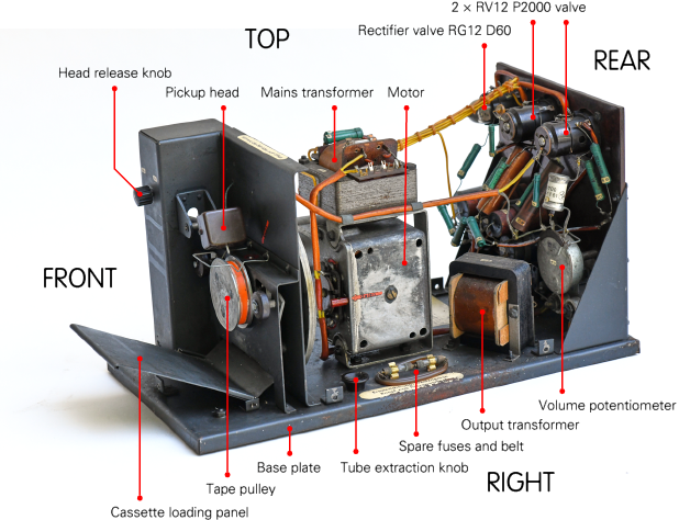 amplifier valves at the top. At the left is the pickup head that is driven by a