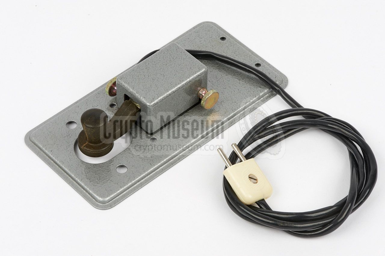 a cable storage box. In the image on the right, a small morse key, connected