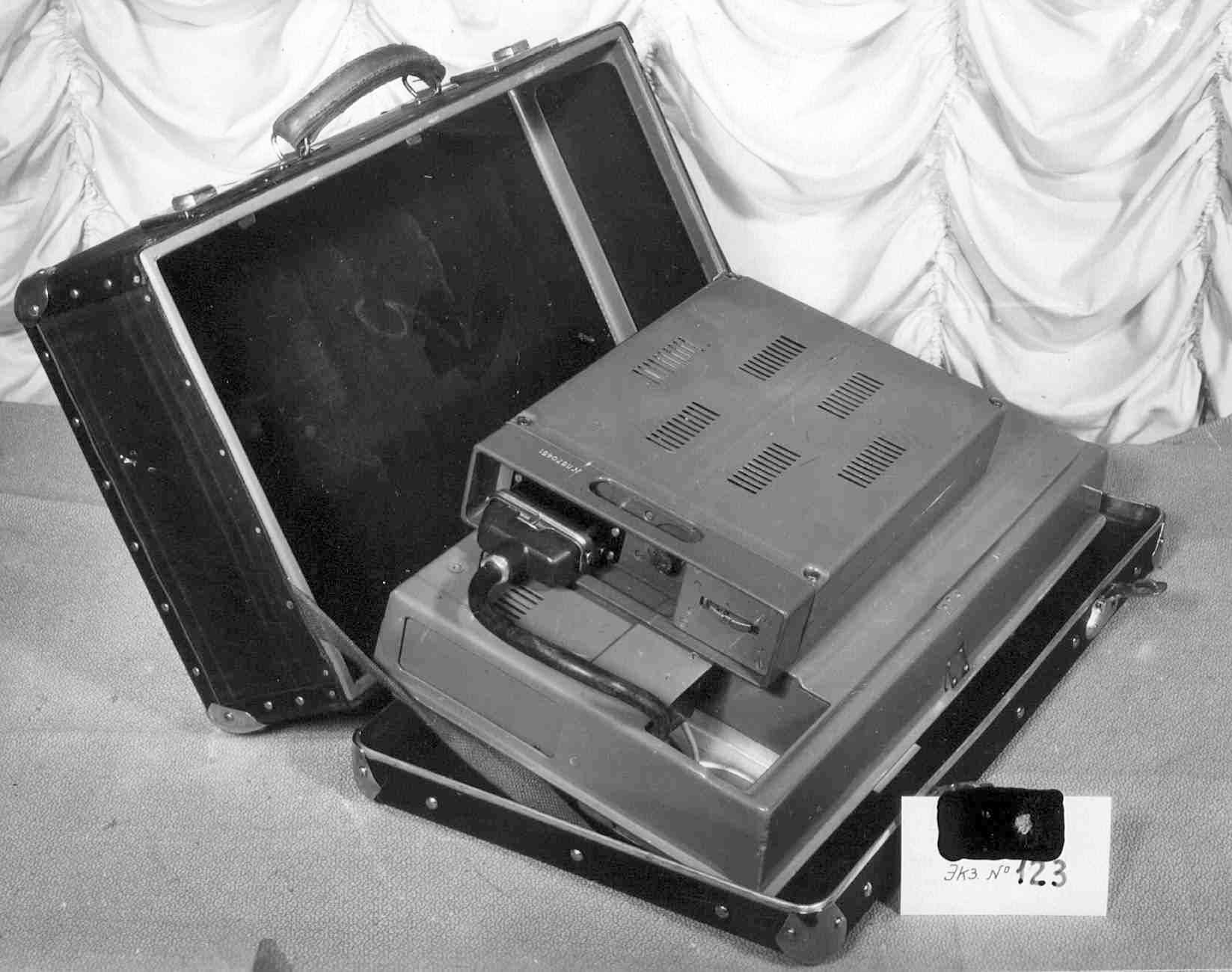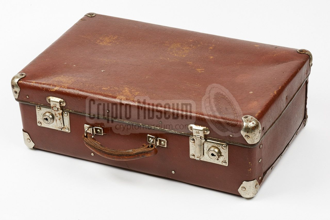mounted inside a standard fibreboard travel suitcase of the era,